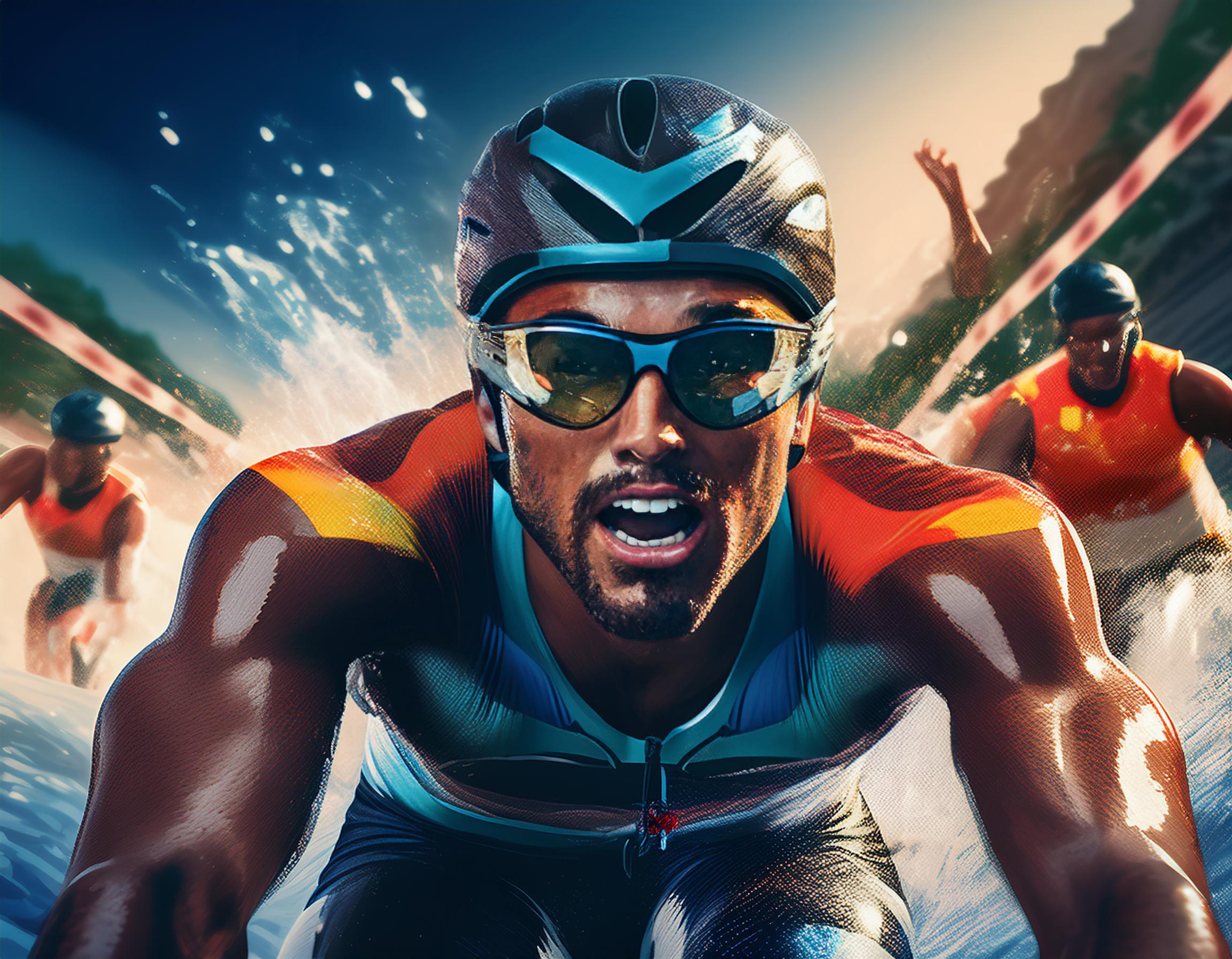 - 수영: 철인 3종 경기는 수영으로 시작합니다. 대부분의 경기에서 바다, 호수, 강 등의 자연 수역에서 경기가 진행되며, 물속에서 여러 참가자와 함께 출발합니다.